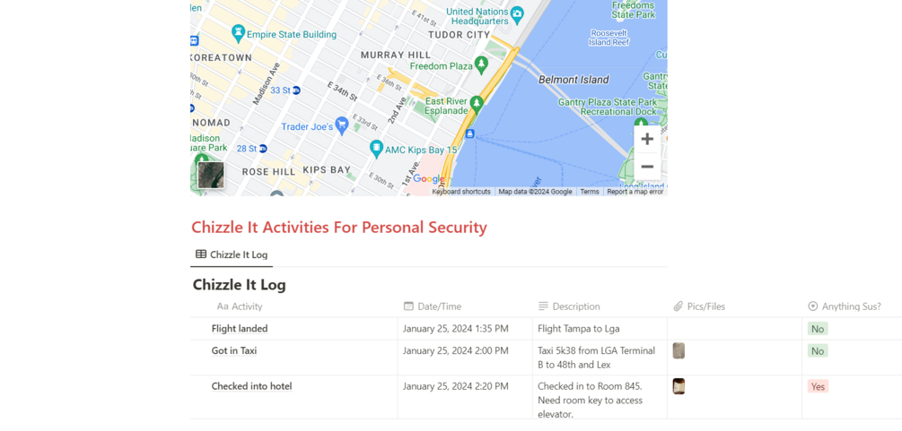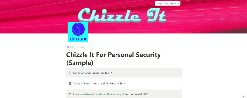 You'll get template that will allow to document and share the details of your travel activities while away from home. You'll also receive a video on how to use Chizzle It for Personal Security.